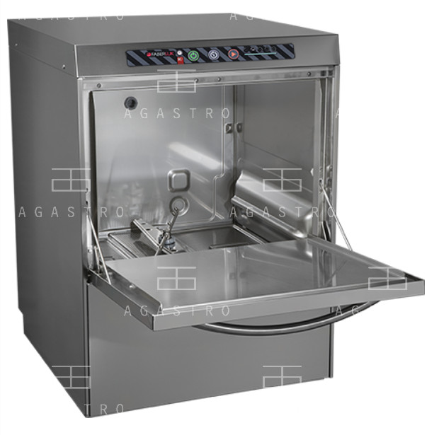 Professzionális mosogatógép-boilerrel szerelt egység, mely rozsdamentes acélból (AISI 304) készült, dupla falú kivitelben. A medence lekerekített élekkel lett kialakítva, hogy a tisztítás egyszerűbb legyen. A mosás és az öblítés külön, független rendszerben működik, alsó és felső hajtással – ez azt jelenti, hogy mindkét irányból végezhető a munkafolyamat. Az ajtó szintén dupla falú, az öblítésről pedig „Rinse OK” jelzés gondoskodik, amely garantálja, hogy az öblítés sikeresen megtörtént.
